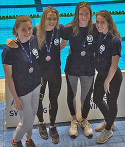 girls-14-16-nationals-16-100IM-bronze2In the 14/16 years 4 x 100 IM relay Guildford B team comprised of Kate Windle, Amy Hodgson, Ciara Walsh and Ellenor Rixon. The team swam very well gaining a PB on their entry time finishing in 4.33.33. Guildford A team had a phenomenal swim in the heats with a 5 second improvement on their start time coming first in 4.18.50. The team of Sophia Wilson, Tatiana Belongoff, Alicia Wilson and Molly Robinson then went on to gain a further improvement in their time and won a well-deserved Bronze medal in 4.16.62.
