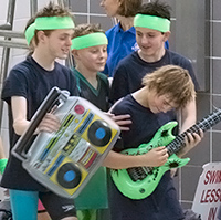 The event was great fun from the word go and thanks to Laura we paraded in fluorescent green head and wrist bands. To complete the eighties vibe we had the inflatables- 3 electric guitars and a massive ghetto blaster. Much dancing and the National anthem later we got down to the serious business of swimming.